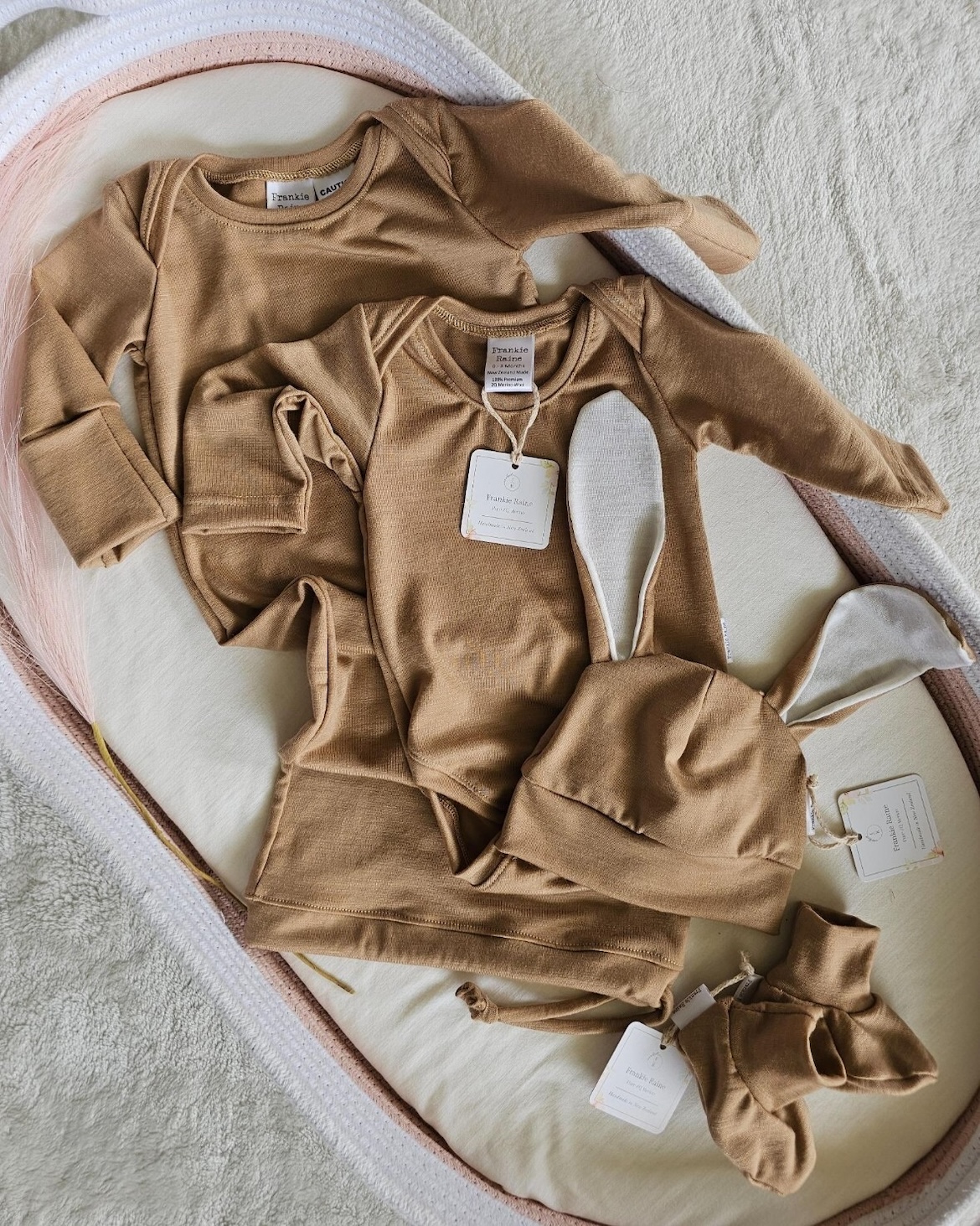 In the beginning, Frankie Raine was a very small and considered project. I started by researching natural fibres, sourcing quality merino and spending a lot of time refining simple designs that would genuinely work for newborns and their parents.